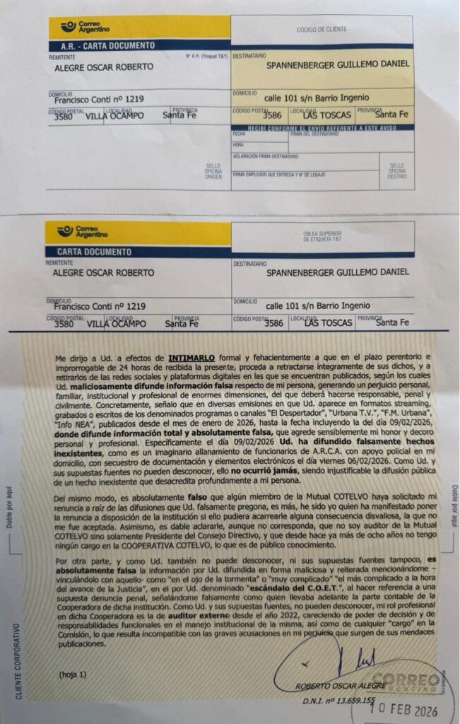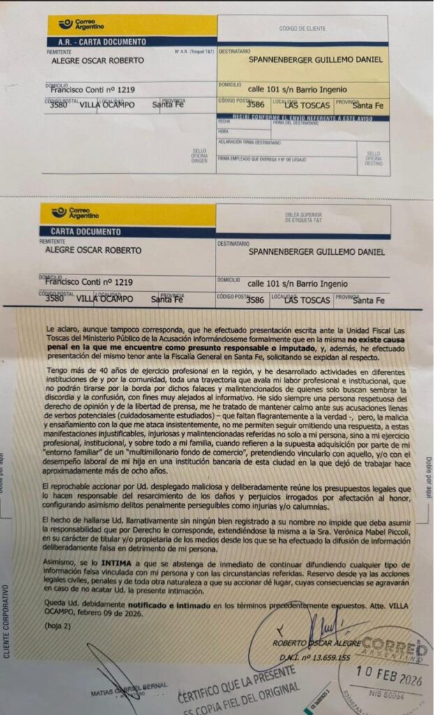 A través de carta documento, el contador Roberto Alegre le responde a un periodista por los agravios recibidos.