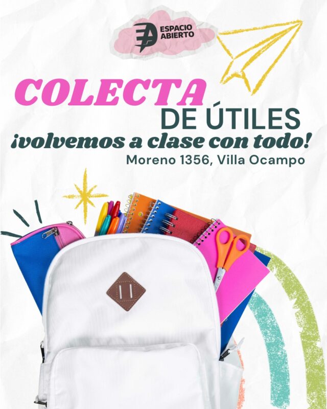 Los integrantes de Espacio Abierto invitan a la comunidad a participar de la Colecta de Útiles Escolares, que se llevará a cabo hasta el 25 de febrero.