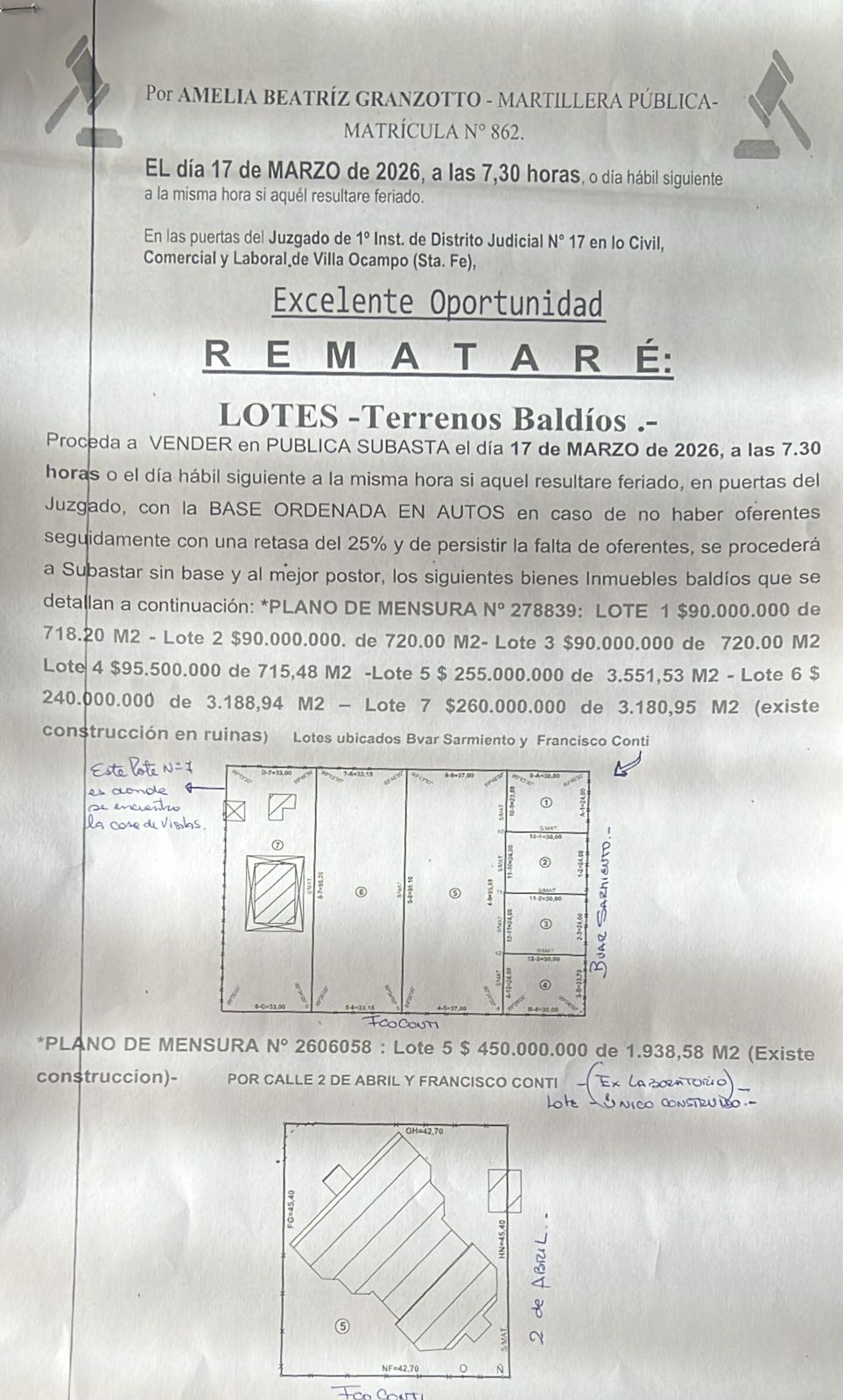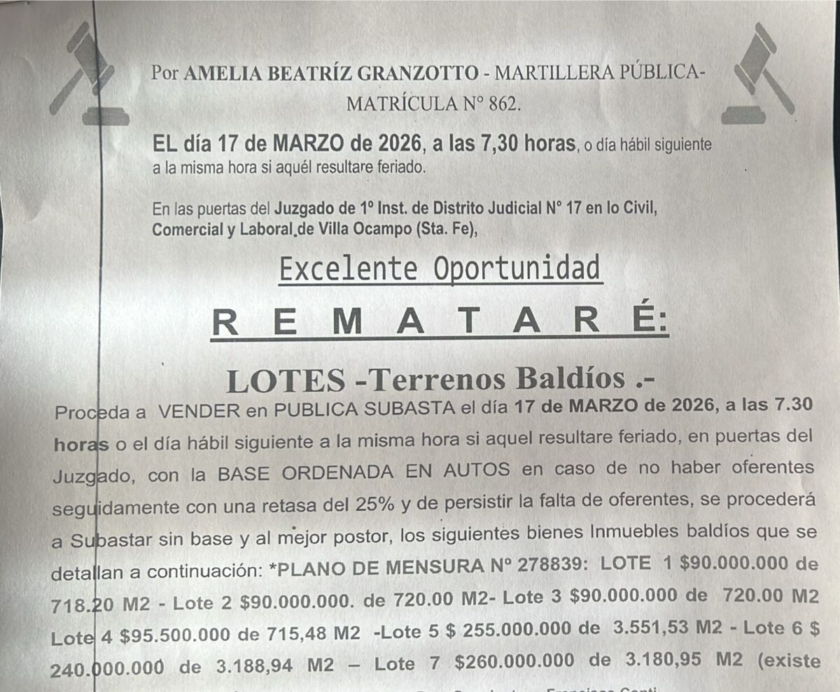 El remate representa una oportunidad tanto para inversores como para particulares interesados en adquirir terrenos en sectores urbanos consolidados de Villa Ocampo, en un contexto donde la tierra continúa siendo una de las alternativas más elegidas para resguardar valor y proyectar desarrollos a futuro.