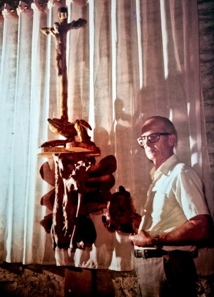 Entre esas expresiones de fe, el investigador rescató una historia ocurrida en Villa Ocampo: la donación de una cruz tallada por el recordado artesano Aníbal Gregoret, destinada a la Gobernación Militar de las Islas Malvinas en mayo de 1982, cuando estaban bajo dominio argentino durante la Guerra del Atlántico Sur.