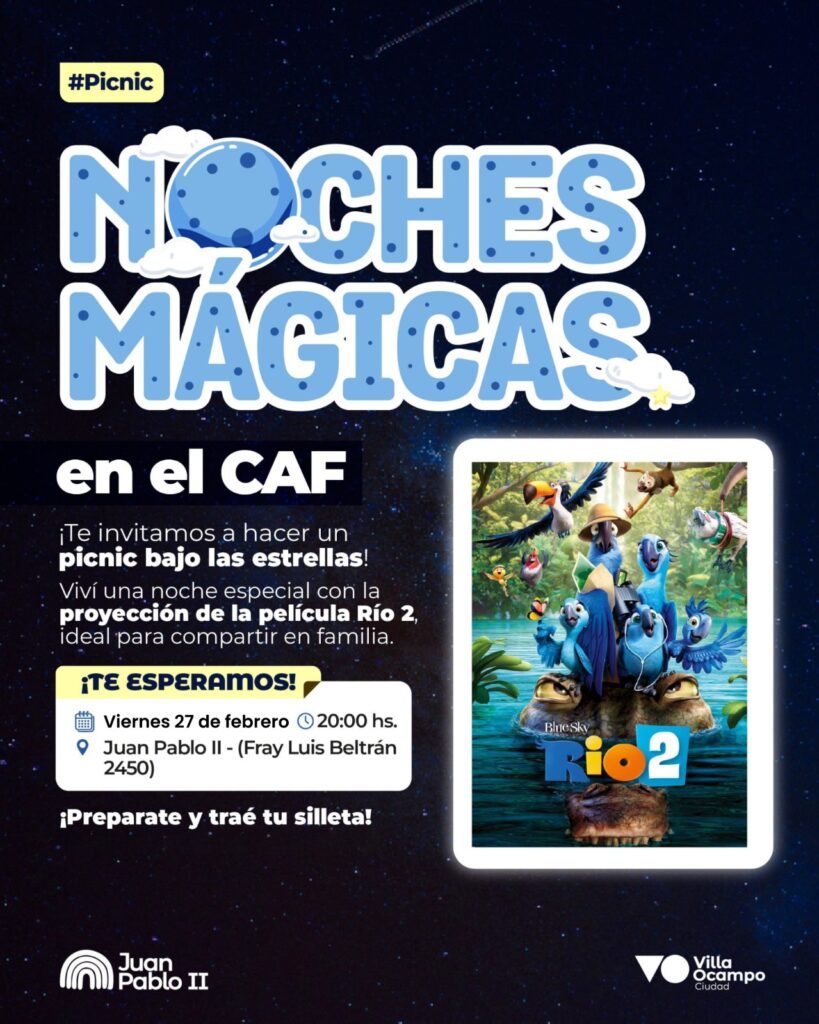 La Municipalidad de Villa Ocampo invita a la comunidad a participar de una nueva propuesta recreativa y cultural denominada “Noches Mágicas en el CAF” , que se llevará a cabo el próximo viernes 27 de febrero , a las 20:00 horas , en el CAF Juan Pablo II , ubicado en Fray Luis Beltrán 2450.