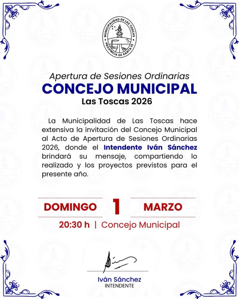 La Municipalidad de Las Toscas hace extensiva la invitación del Concejo Municipal al Acto de Apertura de Sesiones Ordinarias 2026, donde el Intendente Iván Sánchez brindará su mensaje, compartiendo lo realizado y los proyectos previstos para el presente año.