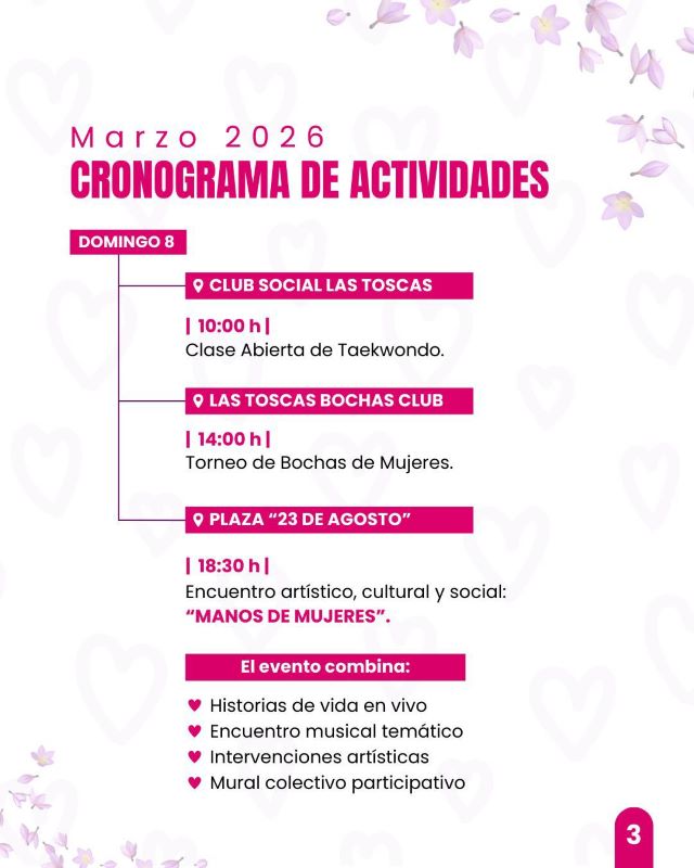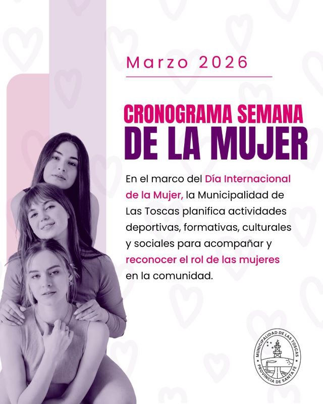En el marco del Día Internacional de la Mujer, la Municipalidad de Las Toscas presenta un cronograma de actividades deportivas, culturales, formativas e institucionales, reafirmando el compromiso con la promoción de derechos y el reconocimiento del rol de las mujeres en nuestra comunidad.