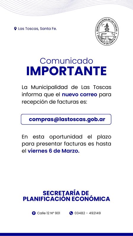 La Municipalidad de Las Toscas emitió un comunicado importante informando a proveedores y vecinos sobre la actualización del correo electrónico destinado a la recepción de facturas.