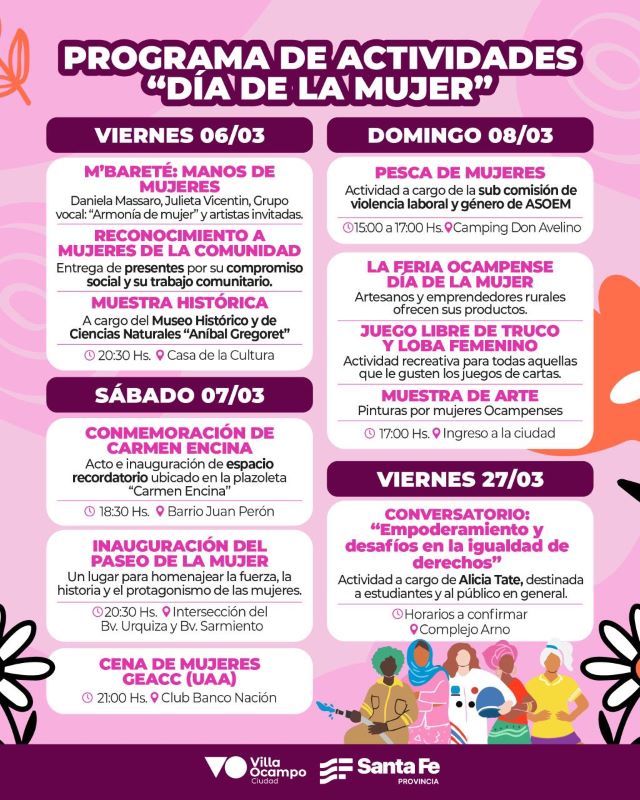 En el marco del Día Internacional de la Mujer, la Municipalidad de Villa Ocampo presentó el programa de actividades que se desarrollará durante el mes de marzo, bajo el lema “Mujeres que dejan huellas”, con propuestas culturales, sociales, recreativas y de reflexión destinadas a reconocer el aporte y protagonismo de las mujeres en la comunidad.
