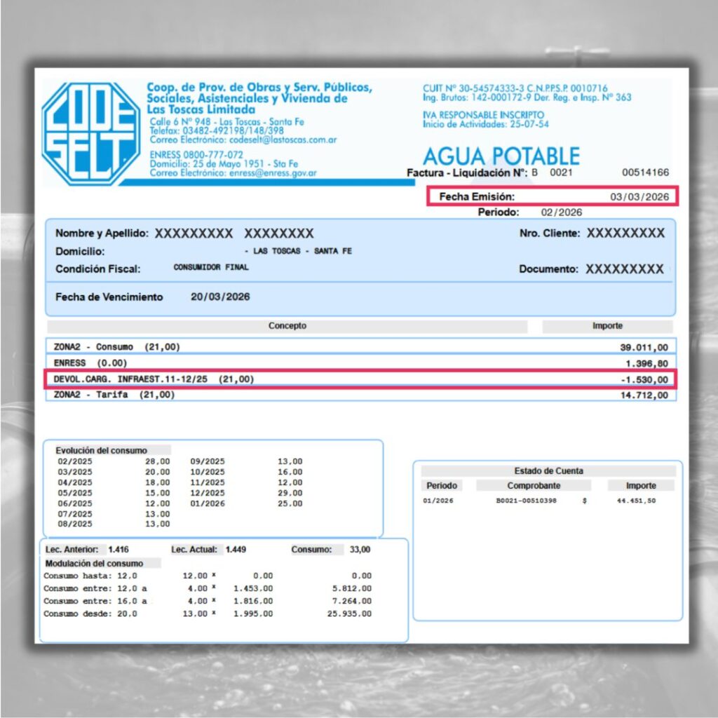 La cooperativa informa que ya se realizó la devolución del cargo de infraestructura que por error se aplicó en las facturas del servicio de agua potable de todos los socios durante los meses de noviembre y diciembre.