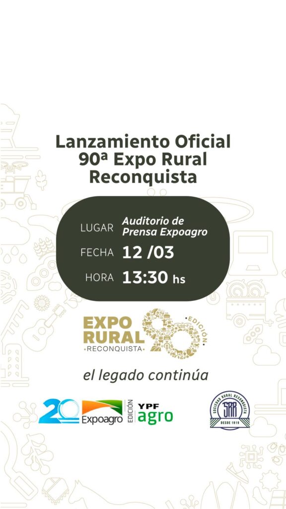 La Sociedad Rural de Reconquista realizará este jueves 12 de marzo a las 13:30 el lanzamiento oficial de la 90° Expo Rural de Reconquista, en el Auditorio de Prensa de Expoagro 2026, la megamuestra agroindustrial que se desarrolla en la ciudad de San Nicolás (Buenos Aires).