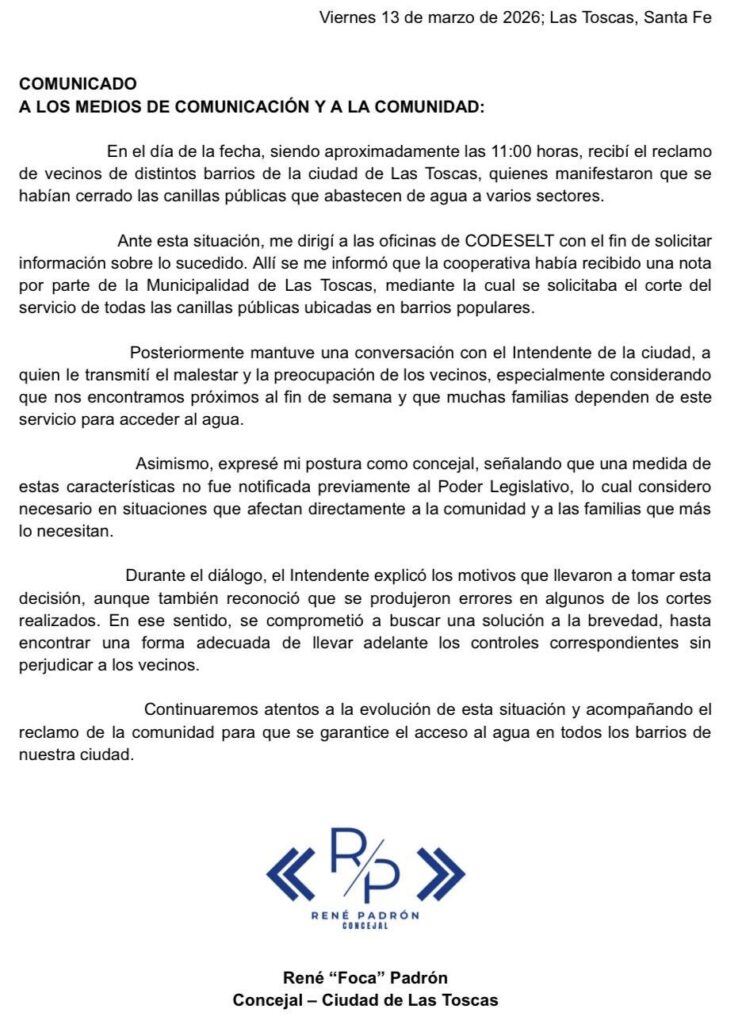 En medio de la situación, el concejal René Daniel “Foca” Padrón fue señalado por los vecinos como el único edil que se habría comunicado con los afectados para interiorizarse sobre lo ocurrido. Según indicaron, el concejal también habría solicitado explicaciones a la cooperativa y dialogado con el intendente, quien habría señalado que se trató de un error y que el suministro sería restablecido.