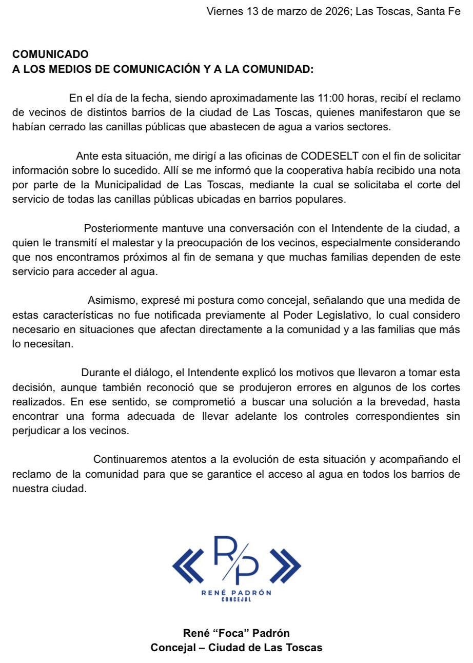 En medio de la situación, el concejal René Daniel “Foca” Padrón fue señalado por los vecinos como el único edil que se habría comunicado con los afectados para interiorizarse sobre lo ocurrido. Según indicaron, el concejal también habría solicitado explicaciones a la cooperativa y dialogado con el intendente, quien habría señalado que se trató de un error y que el suministro sería restablecido.