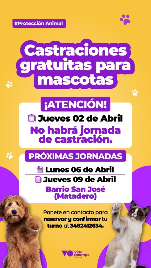 La Municipalidad de Villa Ocampo informa a la comunidad que, en el marco del programa de castraciones gratuitas para mascotas, este será el cronograma previsto.