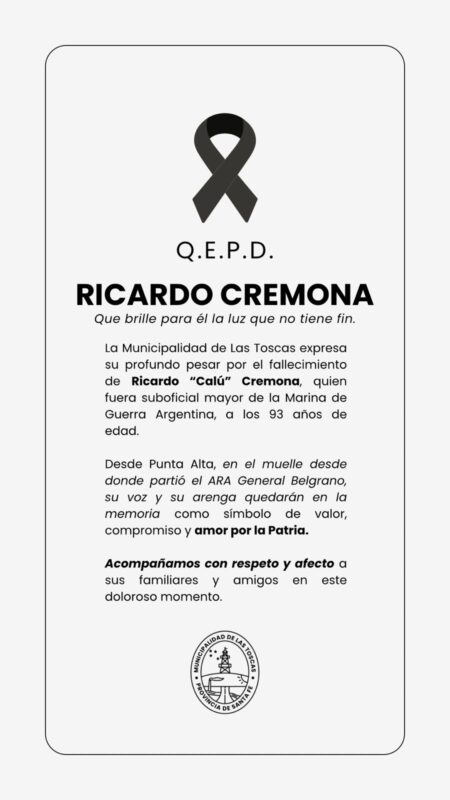 DestacadasNecrológicas Fallecimiento de Ricardo «Calú» Cremona 2 abril, 2026 Compartir en Facebook Compartir en Twitter tweet La Municipalidad de Las Toscas expresa sus condolencias por el fallecimiento de Ricardo «Calú» Cremona, a los 93 años.