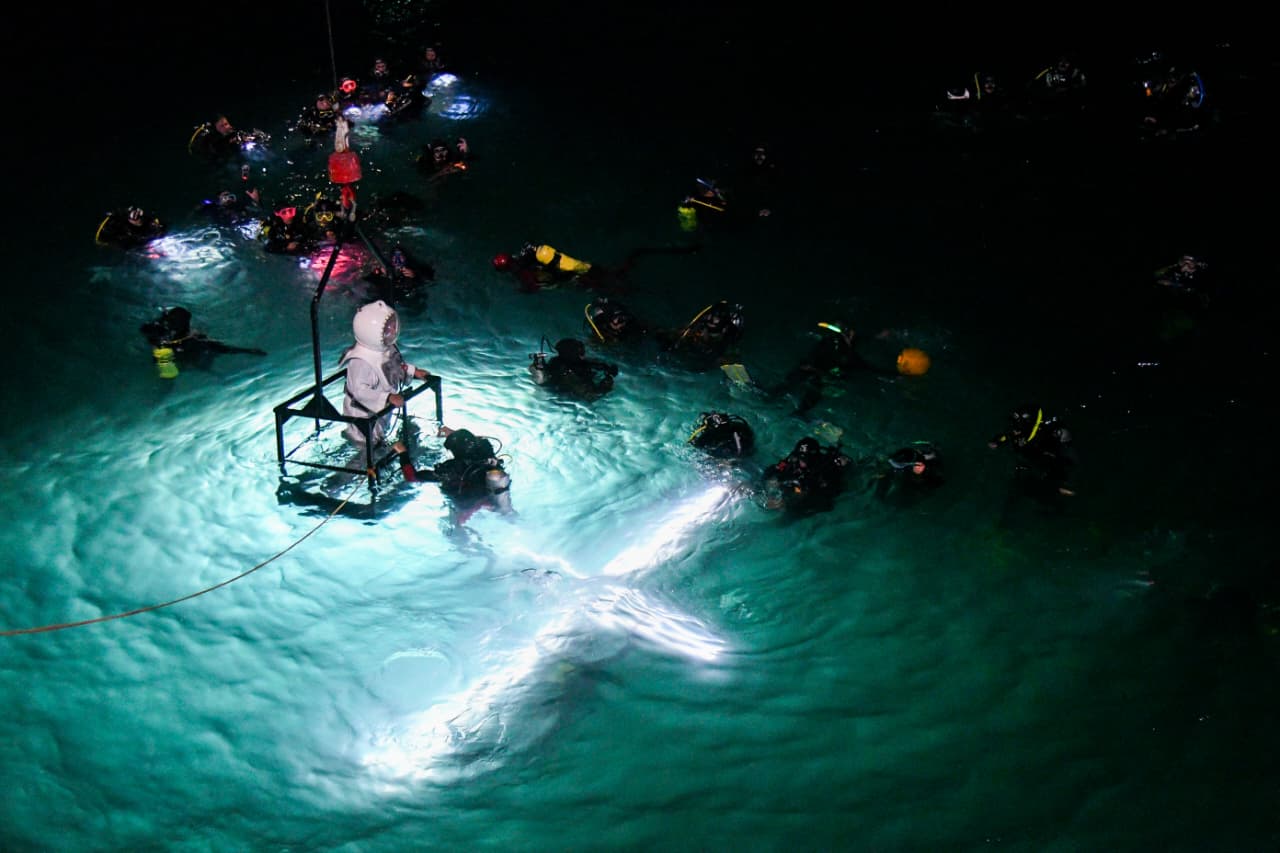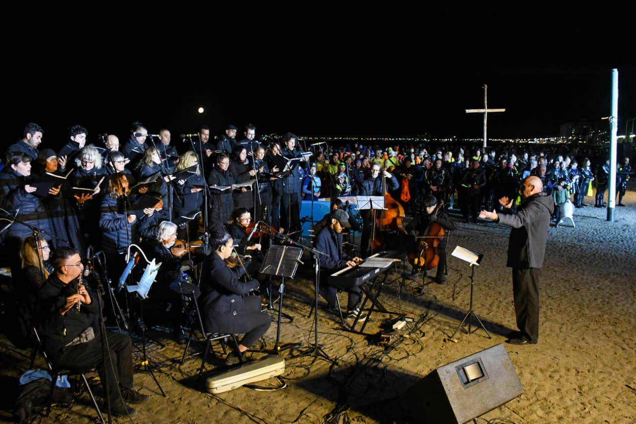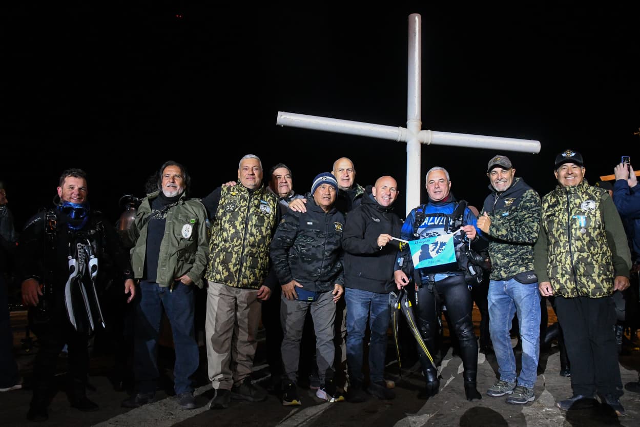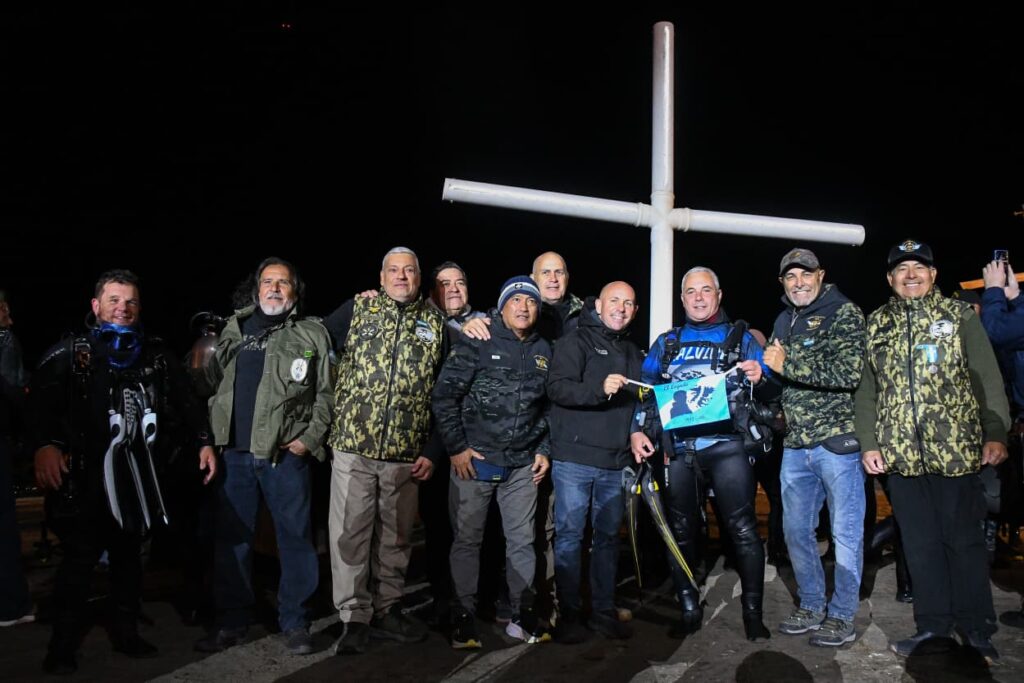 Con la caída de la tarde, el evento adquirió una atmósfera especial: el público comenzó a encender velas y, desde el mar, se proyectó el resplandor de la cruz iluminada junto con las luces de los equipos de buceo y las embarcaciones, generando una postal única.