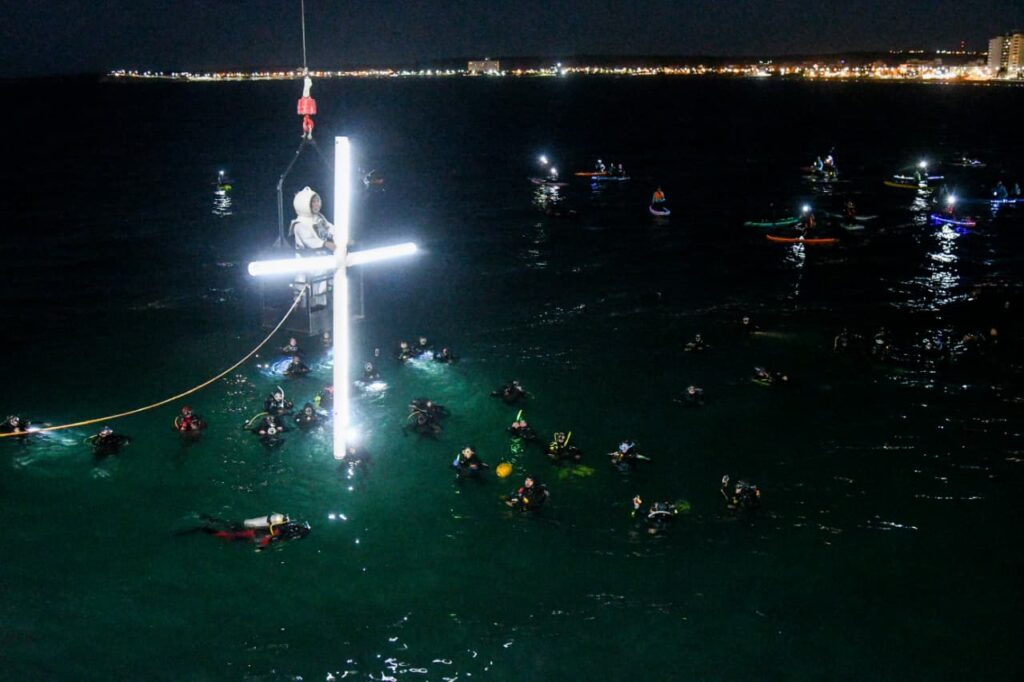 Con la caída de la tarde, el evento adquirió una atmósfera especial: el público comenzó a encender velas y, desde el mar, se proyectó el resplandor de la cruz iluminada junto con las luces de los equipos de buceo y las embarcaciones, generando una postal única.