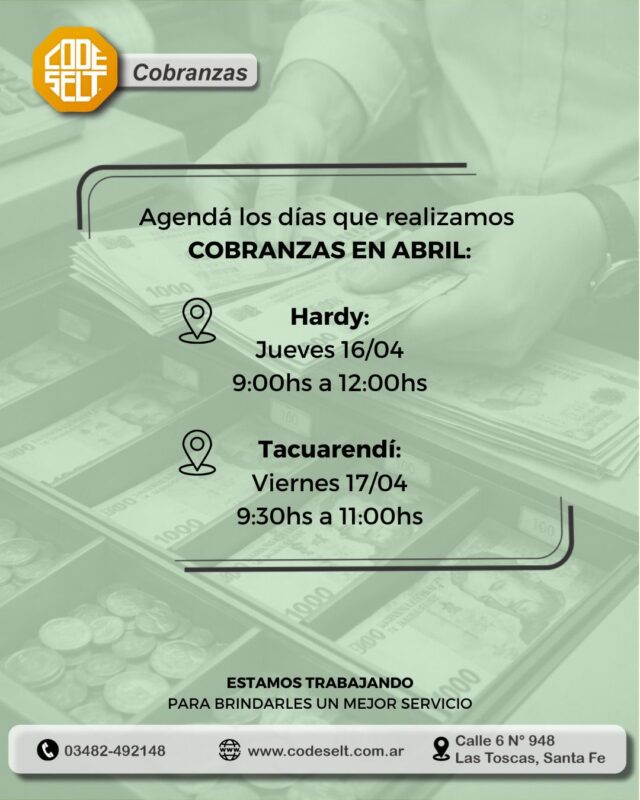 La empresa CODESELT dio a conocer los días y horarios en los que realizará su operativo de cobranzas durante el mes de abril en distintas localidades de la zona.
