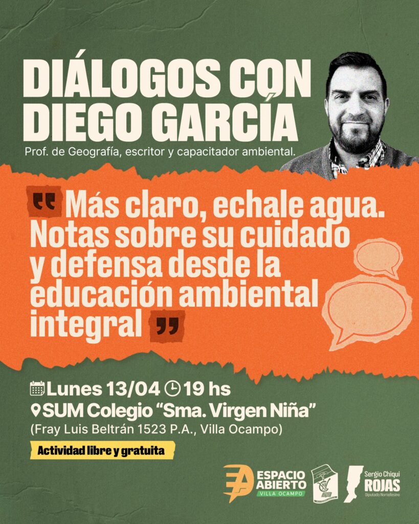 El eje estará puesto en la educación ambiental integral, en línea con la ley que impulsa su incorporación en todos los niveles educativos, y en la necesidad de abordar la conservación del agua como un tema central y urgente. La propuesta apunta a un formato participativo, con intercambio directo con García Ríos – profesor de Geografía, capacitador ambiental y autor de libros como “Ambientalizar la Escuela”, “Geografías de lo Cotidiano” y “Trashumantes”-.