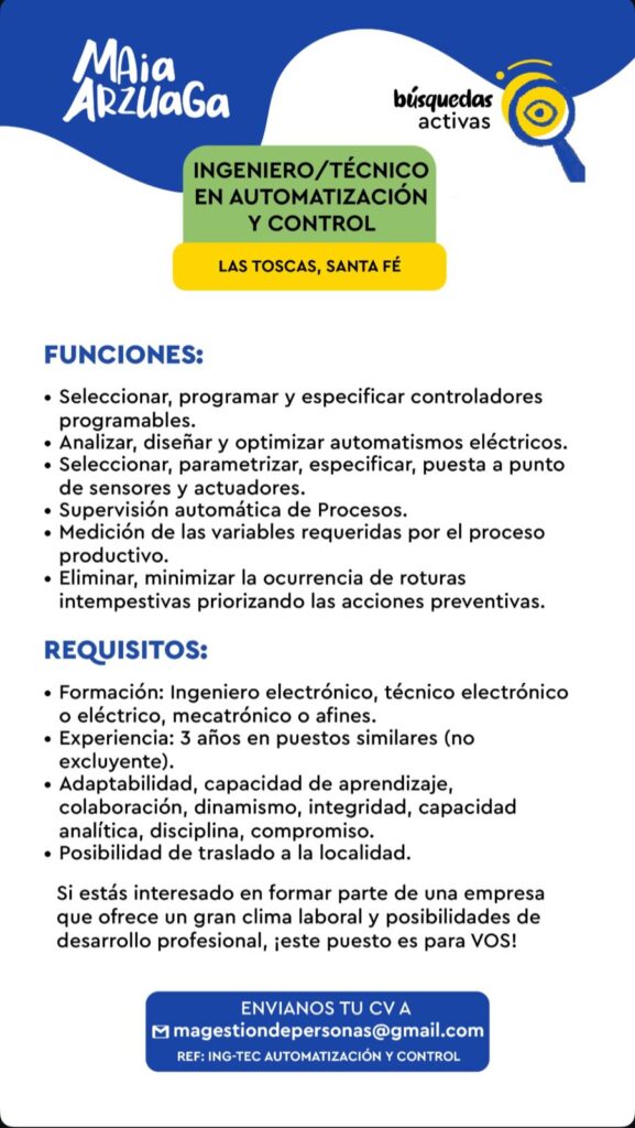 Se encuentra abierta una búsqueda laboral en la ciudad de Las Toscas para cubrir el puesto de ingeniero o técnico en automatización y control, orientado a perfiles con formación en el área electrónica, eléctrica o mecatrónica.