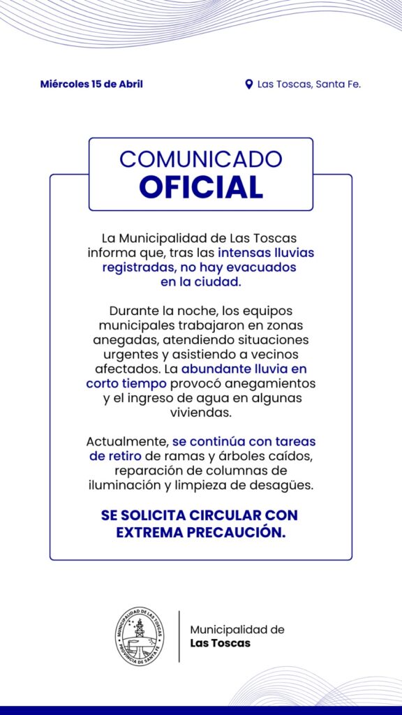 La Municipalidad de Las Toscas informa a la comunidad que, tras las intensas lluvias registradas en las últimas horas, no se han registrado evacuados en la ciudad.