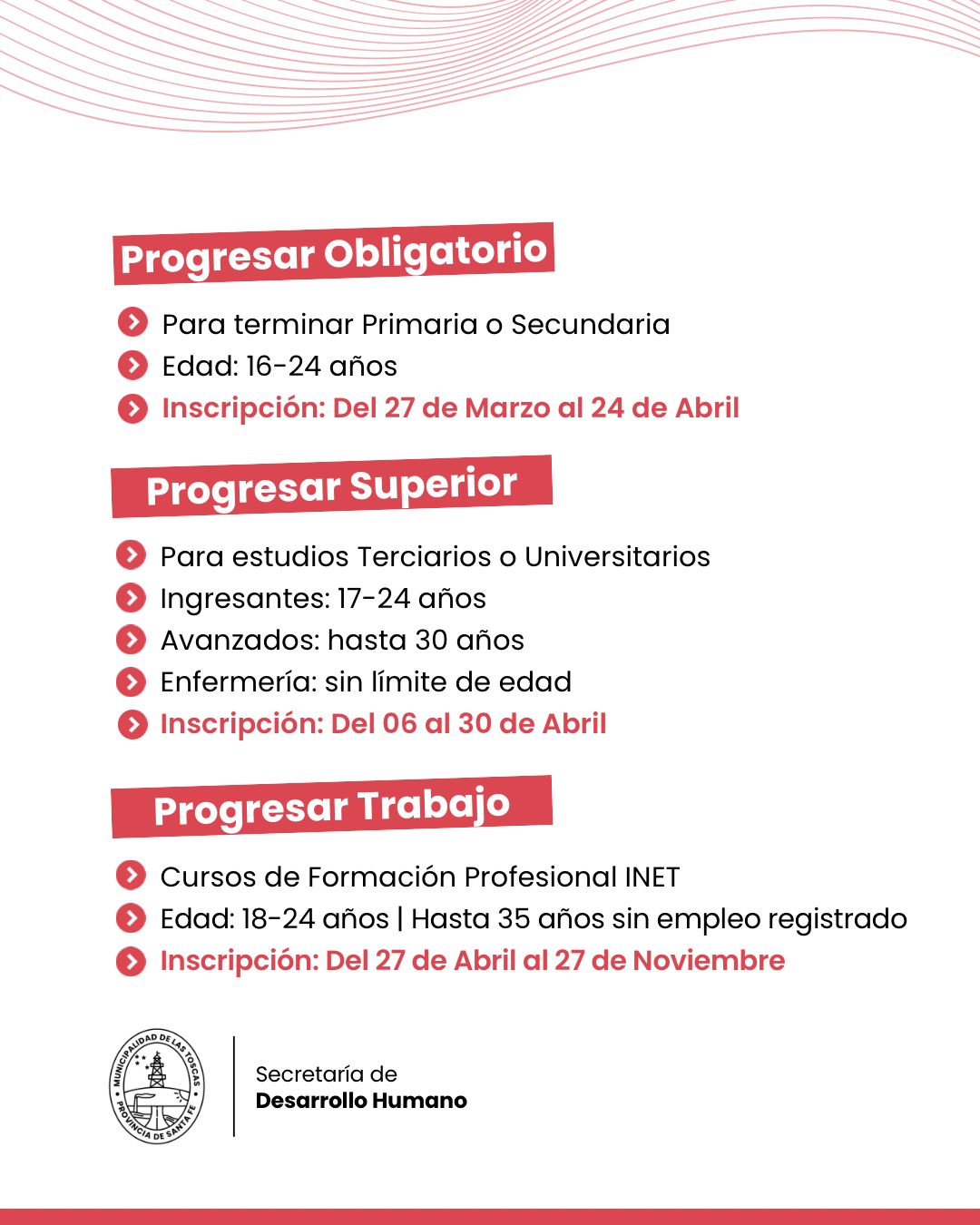 Inscripción online: http://argentina.gob.ar/progresar (con usuario Mi Argentina)