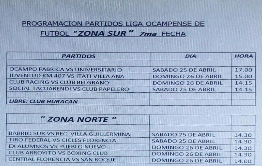 Deportes LOF: Tabla de posiciones y próxima fecha 21 abril, 2026 Compartir en Facebook Compartir en Twitter tweet Se encuentran a continuación las tablas de posiciones y próxima fecha de los partidos de Primera División y Sub 20, tanto zona sur como zona norte, de la Liga Ocampense de Fútbol. Zona Sur Zona Norte