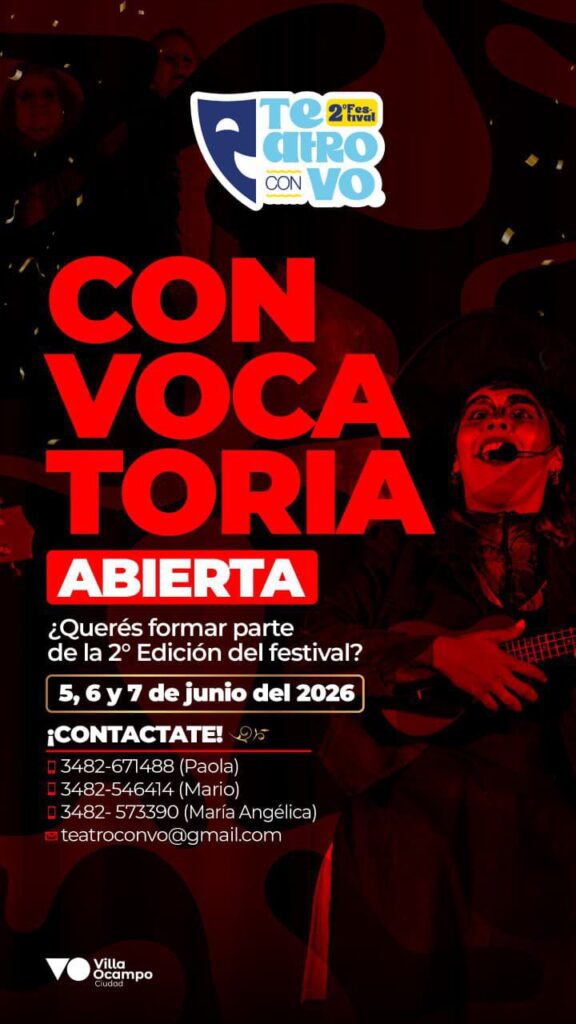 El festival de teatro “Teatro con V.O” anuncia la realización de la segunda edición, que se llevará a cabo los días 5, 6 y 7 de junio de 2026 en la ciudad de Villa Ocampo.