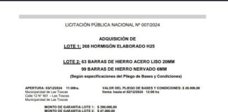 Las Toscas: Licitación pública para compras de hormigón y barras de...